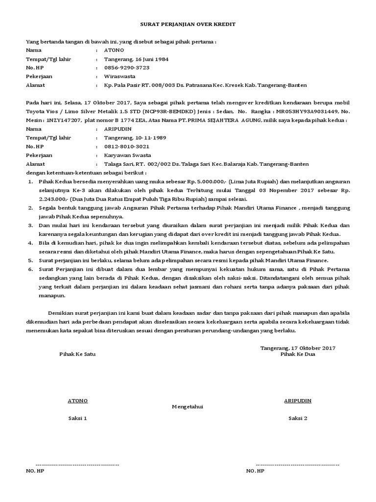 Surat pernyataan over kredit rumah bu euis. Demikian surat perjanjian kredit ini dibuat dengan sebenarnya, dalam keadaan sehat jasmani dan rohani maupun tanpa ada paksaan dari pihak manapun. Contoh surat perjanjian gadai mobil masih kredit yang sah aneka. Surat perjanjian jual beli mobil sangat penting untuk diingat ketika anda menandatangani perjanjian pembelian mobil untuk mobil baru atau bekas yang mahal. Surat perjanjian take over mobil.
